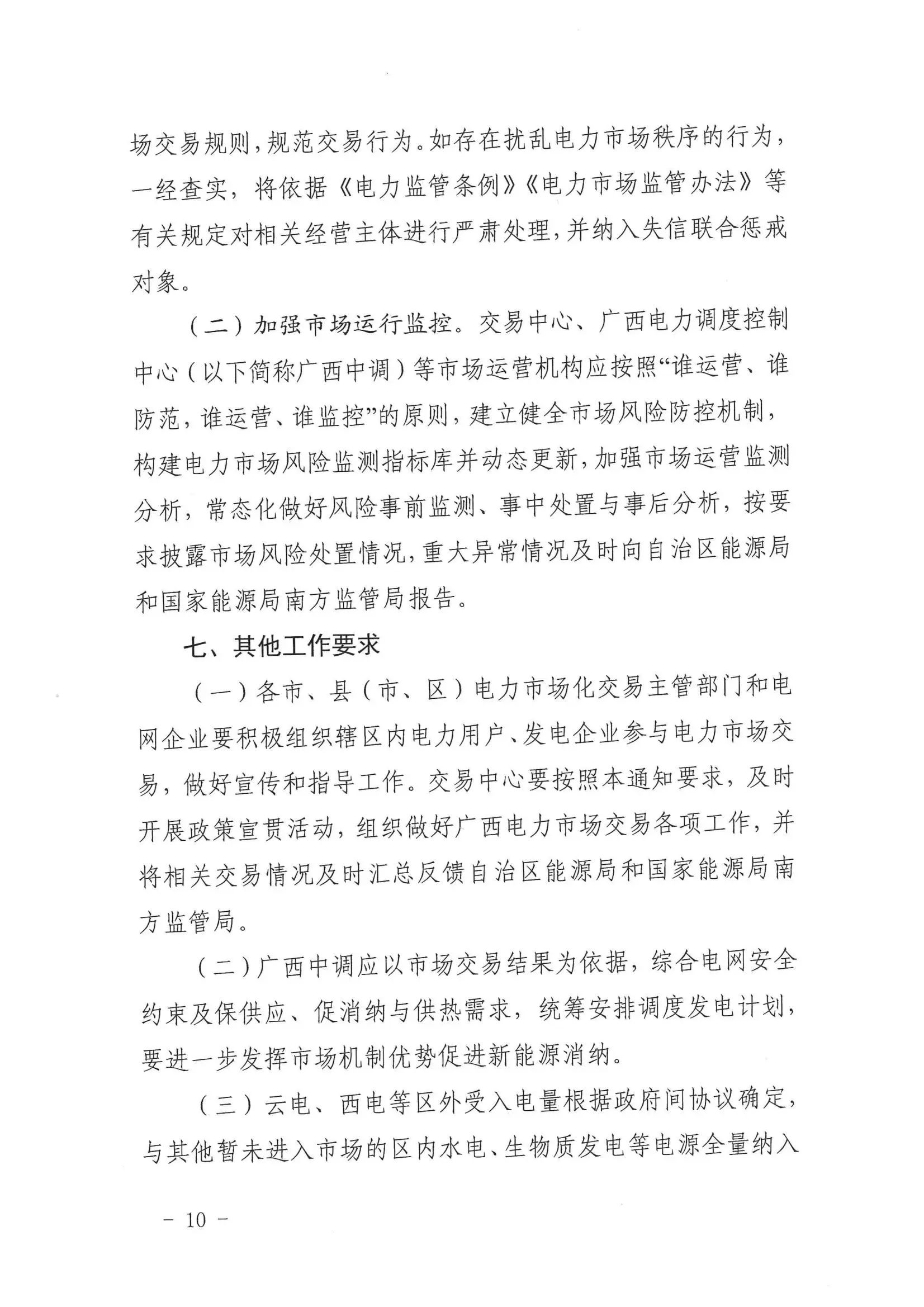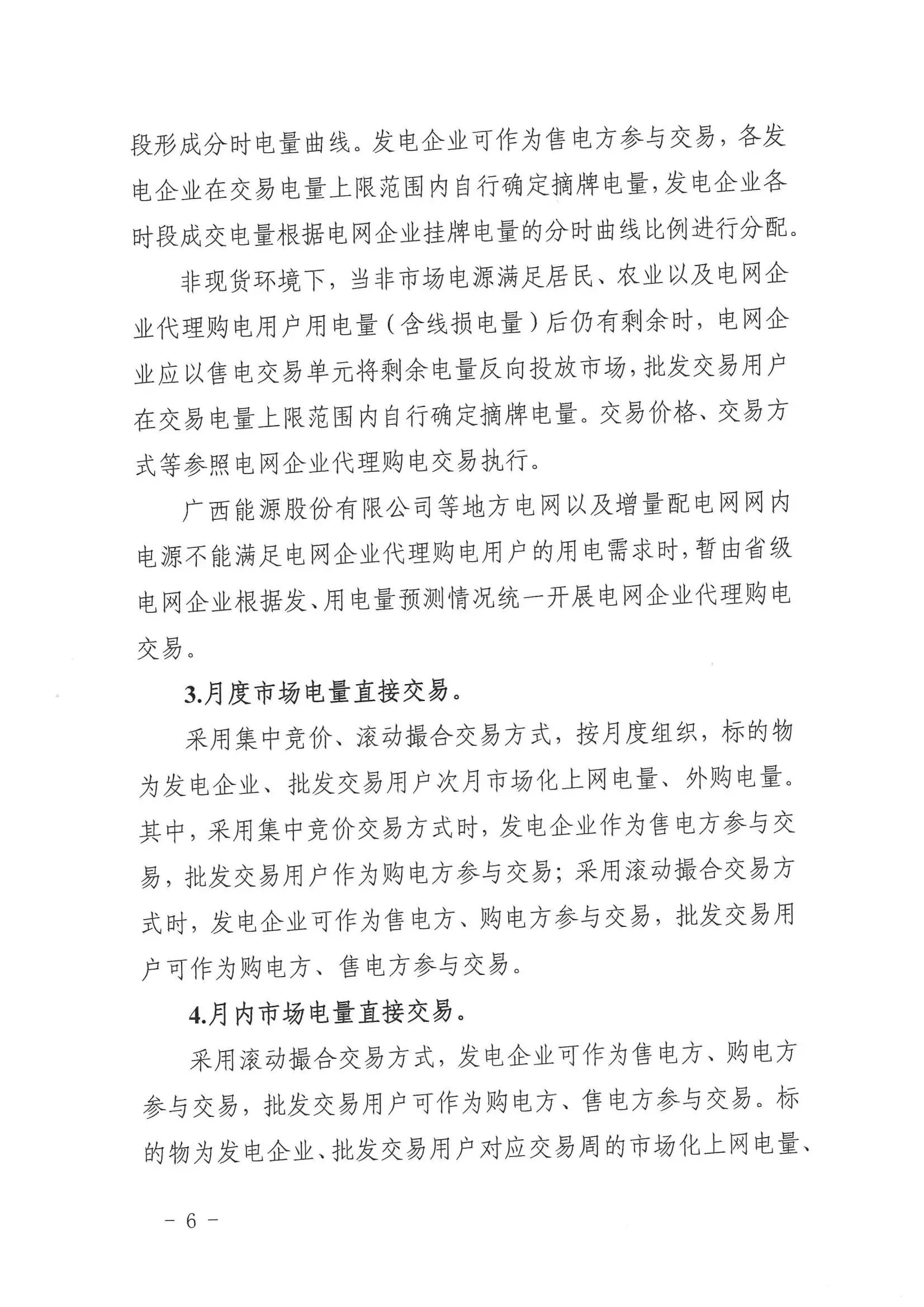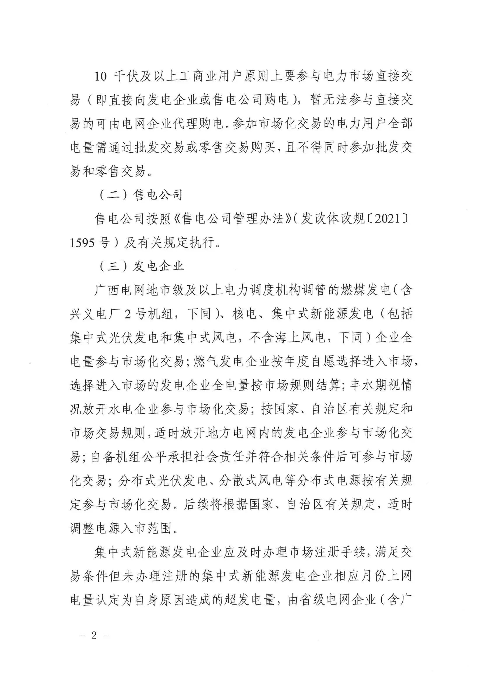 (三)发电企业广西电网地市级及以上电力调度机构调管的燃煤发电(含兴义电厂2号机组,下同)、核电、集中式新能源发电(包括集中式光伏发电和集中式风电,不含海上风电,下同)企业全电量参与市场化交易;燃气发电企业按年度自愿选择进入市场选择进入市场的发电企业全电量按市场规则结算;丰水期视情况放开水电企业参与市场化交易;按国家、自治区有关规定和市场交易规则,适时放开地方电网内的发电企业参与市场化交易;自备机组公平承担社会责任并符合相关条件后可参与市场化交易;分布式光伏发电、分散式风电等分布式电源按有关规定参与市场化交易。后续将根据国家、自治区有关规定,适时调整电源入市范围。