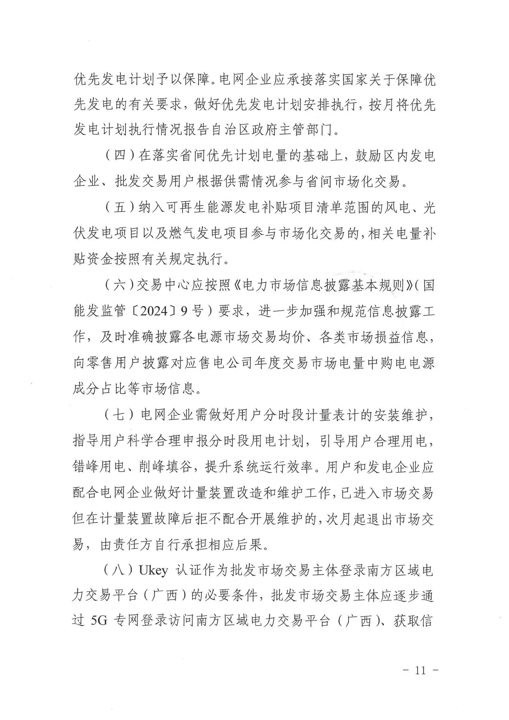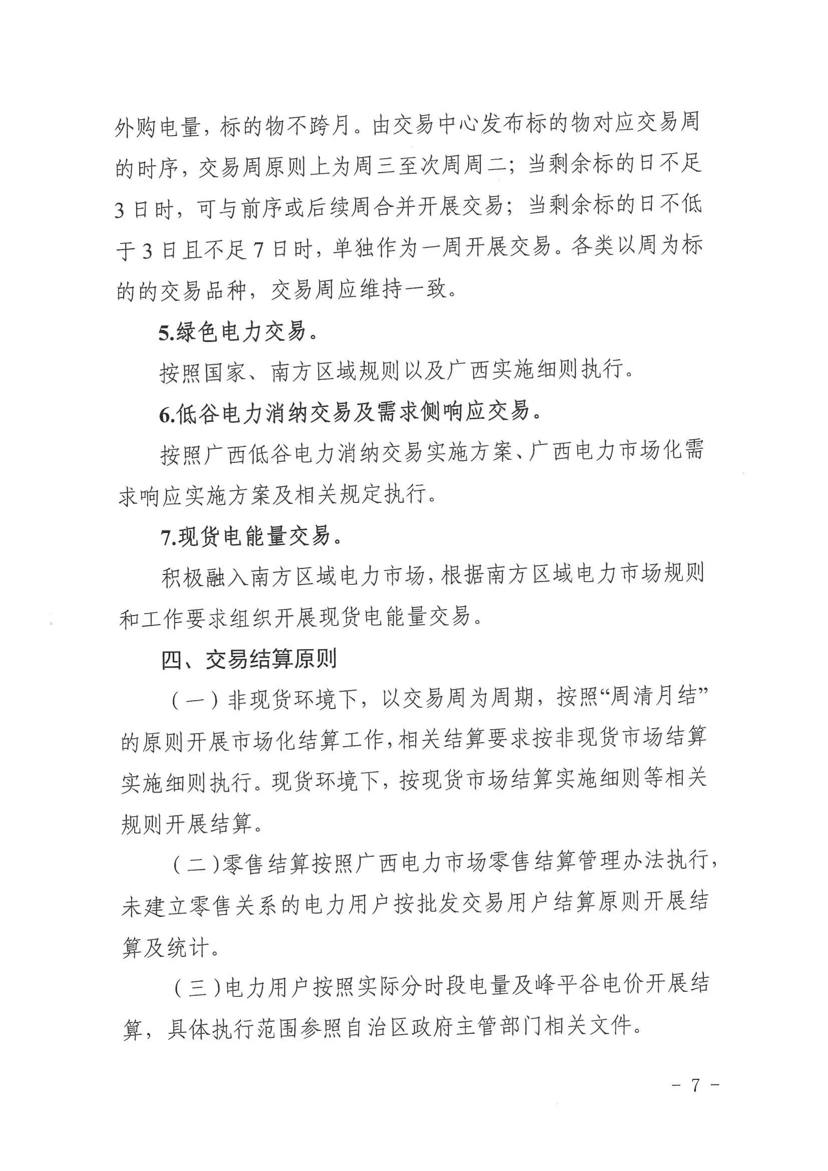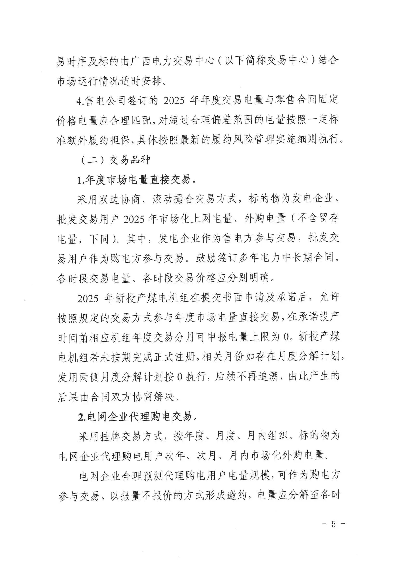 (三)发电企业广西电网地市级及以上电力调度机构调管的燃煤发电(含兴义电厂2号机组,下同)、核电、集中式新能源发电(包括集中式光伏发电和集中式风电,不含海上风电,下同)企业全电量参与市场化交易;燃气发电企业按年度自愿选择进入市场选择进入市场的发电企业全电量按市场规则结算;丰水期视情况放开水电企业参与市场化交易;按国家、自治区有关规定和市场交易规则,适时放开地方电网内的发电企业参与市场化交易;自备机组公平承担社会责任并符合相关条件后可参与市场化交易;分布式光伏发电、分散式风电等分布式电源按有关规定参与市场化交易。后续将根据国家、自治区有关规定,适时调整电源入市范围。