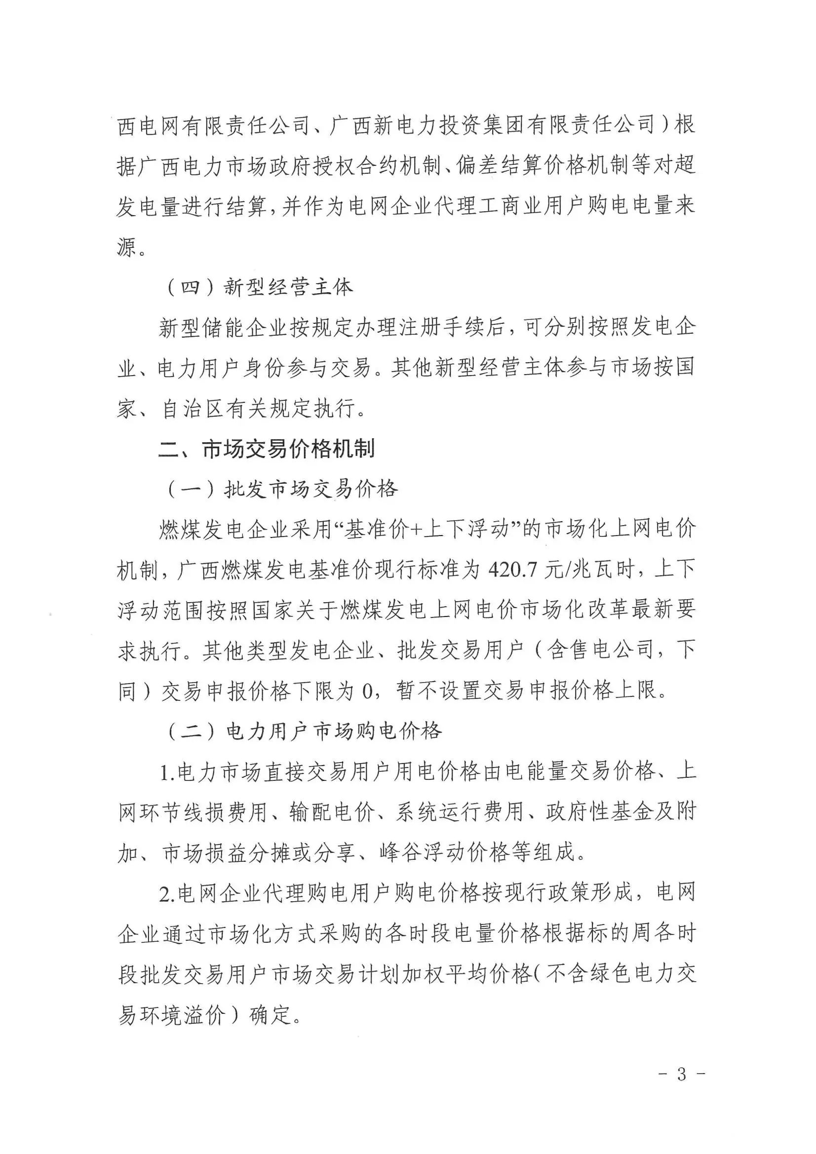 (四)新型经营主体新型储能企业按规定办理注册手续后,可分别按照发电企业、电力用户身份参与交易。其他新型经营主体参与市场按国家、自治区有关规定执行。关于批发市场交易价格:燃煤发电企业采用“基准价+上下浮动”的市场化上网电价机制,广西燃煤发电基准价现行标准为 420.7元/兆瓦时,上下浮动范围按照国家关于燃煤发电上网电价市场化改革最新要求执行。其他类型发电企业、批发交易用户(含售电公司,下同)交易申报价格下限为0,暂不设置交易申报价格上限。