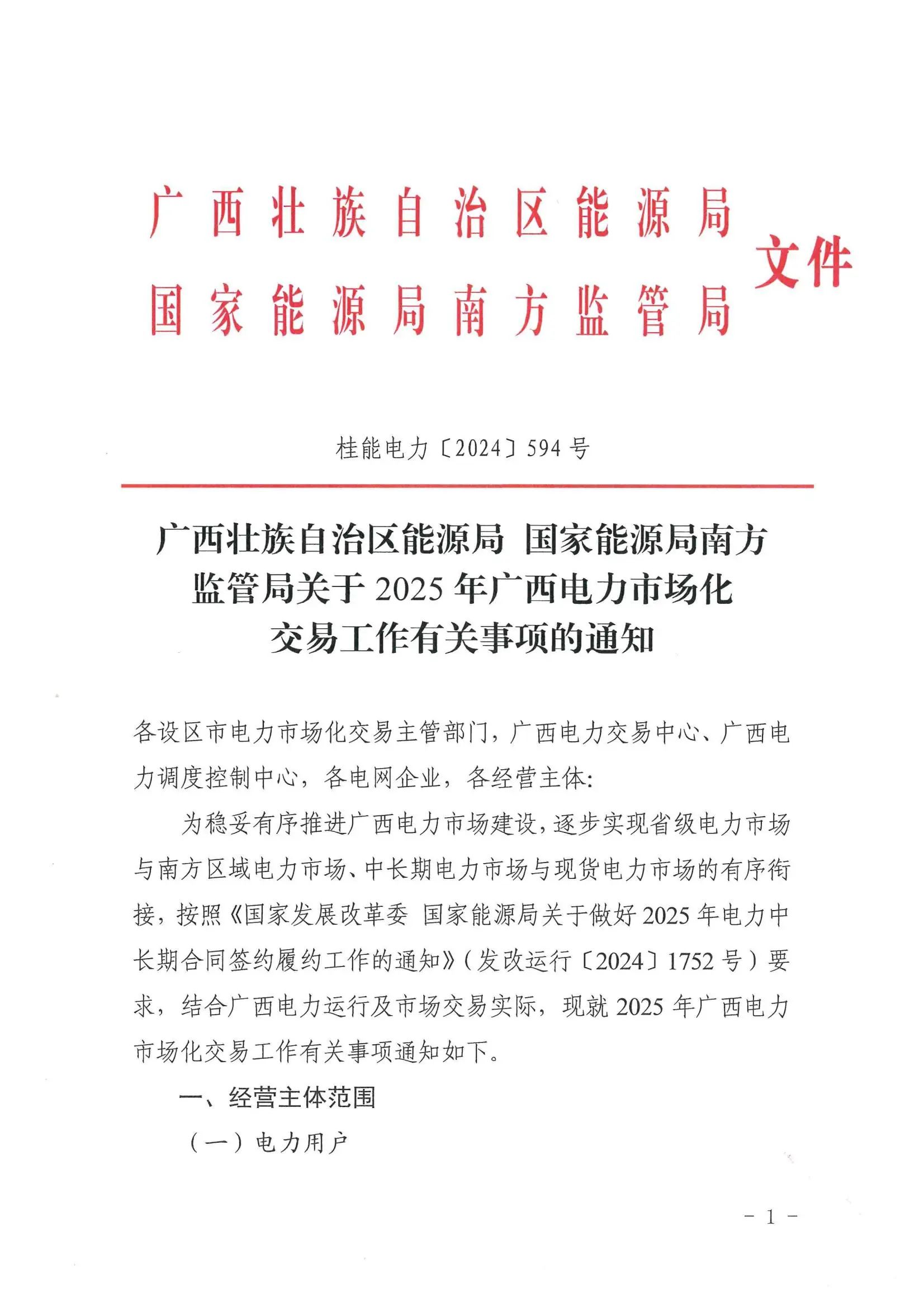 北极星售电网获悉,广西壮族自治区能源局、国家能源局南方监管局近日发布关于2025年广西电力市场化交易工作有关事项的通知(桂能电力【2024】594号),2025年电力中长期交易主要按年度、月度和月内组织开展,包括对应周期的市场电量直接交易、电网企业代理购电交易和绿色电力交易。根据国家、自治区有关规定开展低谷电力消纳交易、需求侧响应交易和绿证交易。适时开展现货电能量交易。
