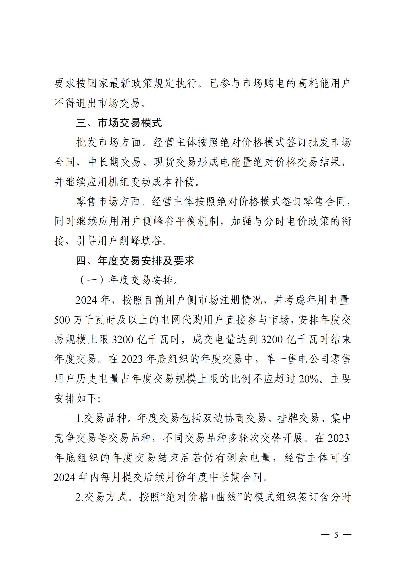 2024年,按照目前用户侧市场注册情况,并考虑年用电量500万千瓦时及以上的电网代购用户直接参与市场,安排年度交易规模上限3200亿千瓦时,成交电量达到 3200 亿千瓦时结束年度交易。